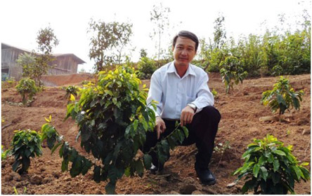 三、本怒县农林局局长在2011年种植的咖啡园里探讨种植技术。