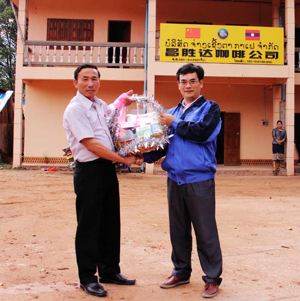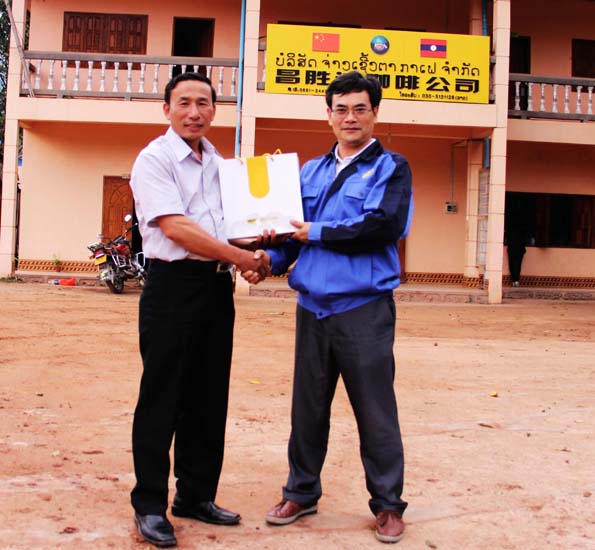 丰沙里省禁毒委主任(左)赠送(老挝)昌胜达咖啡公司礼品